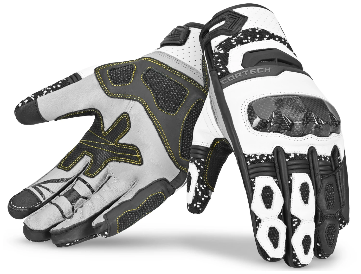 The Cortech Revo ST V2 Gloves are designed for peak performance in high temperatures and demanding terrain. Crafted from durable drum-dyed bovine leather and breathable TecKnit fabric, they offer the perfect balance of protection and comfort. Aramid fiber reinforcements and a full-floating carbon fiber knuckle protector enhance impact resistance, while perforated panels and SuperFabric reinforcements provide durability and airflow to keep your hands cool. With pre-curved fingers and an ergonomic fit, these gloves deliver exceptional control and comfort, making them the ideal choice for any ride.