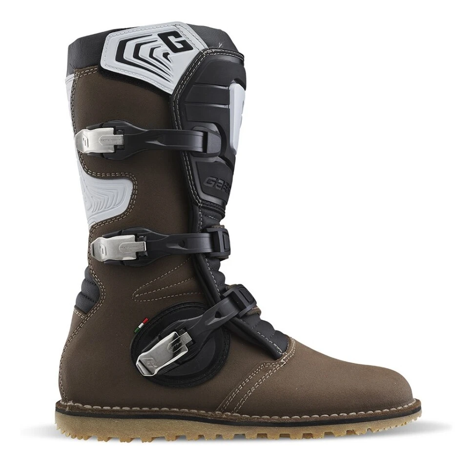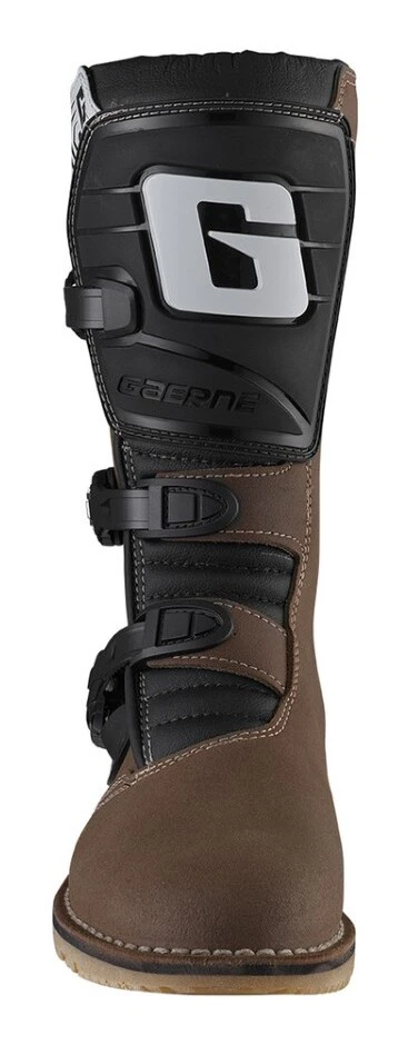 The Balance Pro Tech Boots from Gaerne are a trials riding style boot with additional fortification for rider safety and impact protection. Trial Boot elevates your trial riding experience to new heights. Extending beyond trials type riding, the Balance Pro Tech Boots are also suitable for dual sport and ATV riding as well. A leather upper conceals an anatomically shaped PU shin plate that provides support and impact protection. A reinforced toe area, malleolus support and strategically placed microfiber keep the boots flexible while resisting heat and abrasion. The closure system boasts three adjustable, lightweight alloy buckles that are replaceable. Inside breathable lining enhances air circulation and promotes overall comfort during extended rides. The Gaerne gum rubber trial sole, engineered with a specific compound, assures a non-slip grip for exceptional feel and control of the bike. This sole elevates traction and stability, empowering riders to uphold control and confidence across diverse riding conditions.