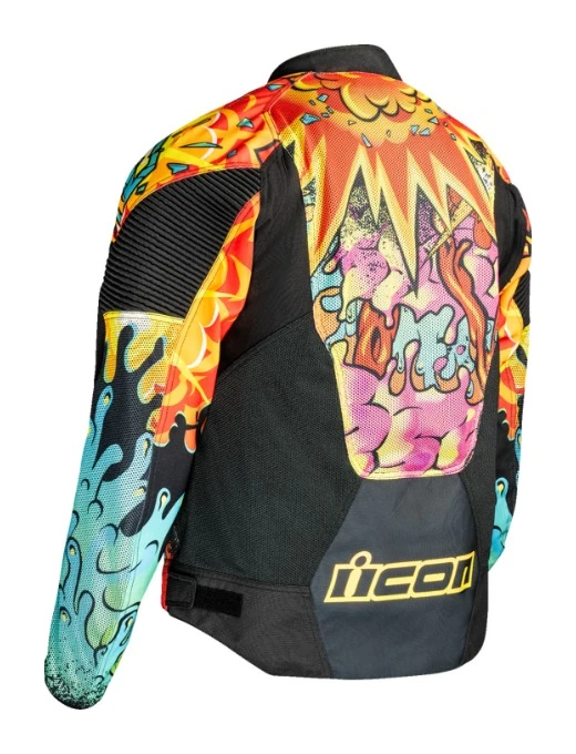 The Icon Scatterbrain Jacket is built for riders who demand airflow, protection and bold style. Its Iron Weave Mesh chassis, reinforced with 300D polyester in high-impact areas, ensures durability and breathability for hot weather rides. Featuring removable D3O impact protectors, reflective accents and eye-catching graphics, this jacket delivers both safety and standout design on the road.